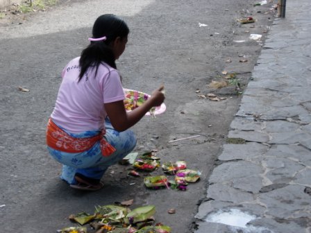在巴厘岛兴都教很风盛,到处都可以看到当地人摆放“canang”,一种如华人上香的习惯,只为求平安。它无所不在,在路边每一间商店外,就连在Discovery Mall Shopping Centre内卖衣服的某一空位内也摆放。